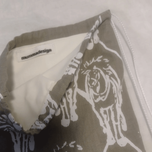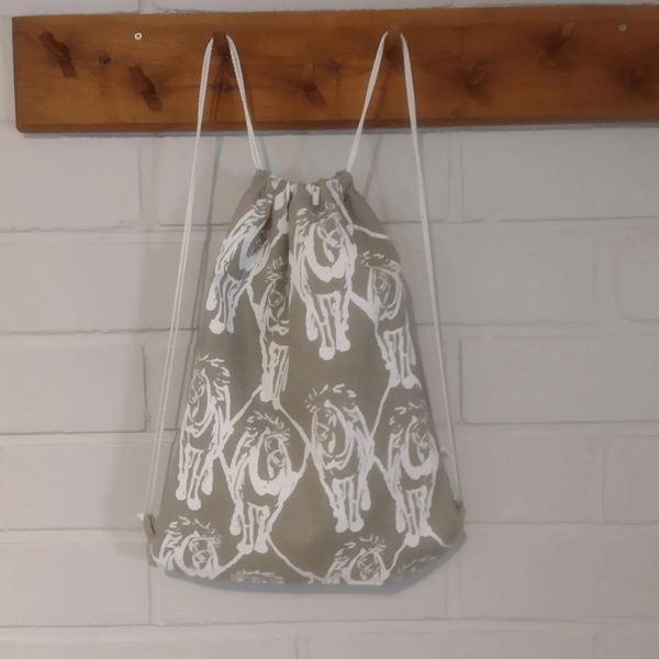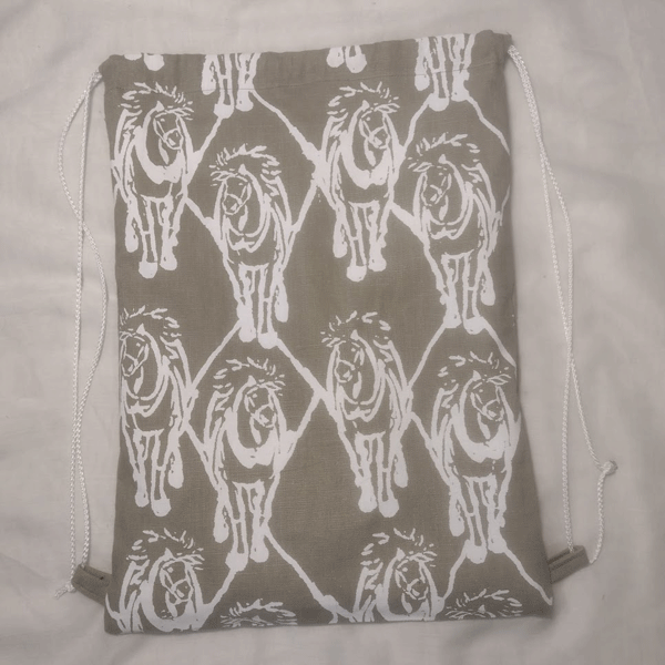Vihreän värisessä narurepussa on valkoinen vuorikangas. Etupuolella on käsinpainettu hevos-aiheinen kuosi.